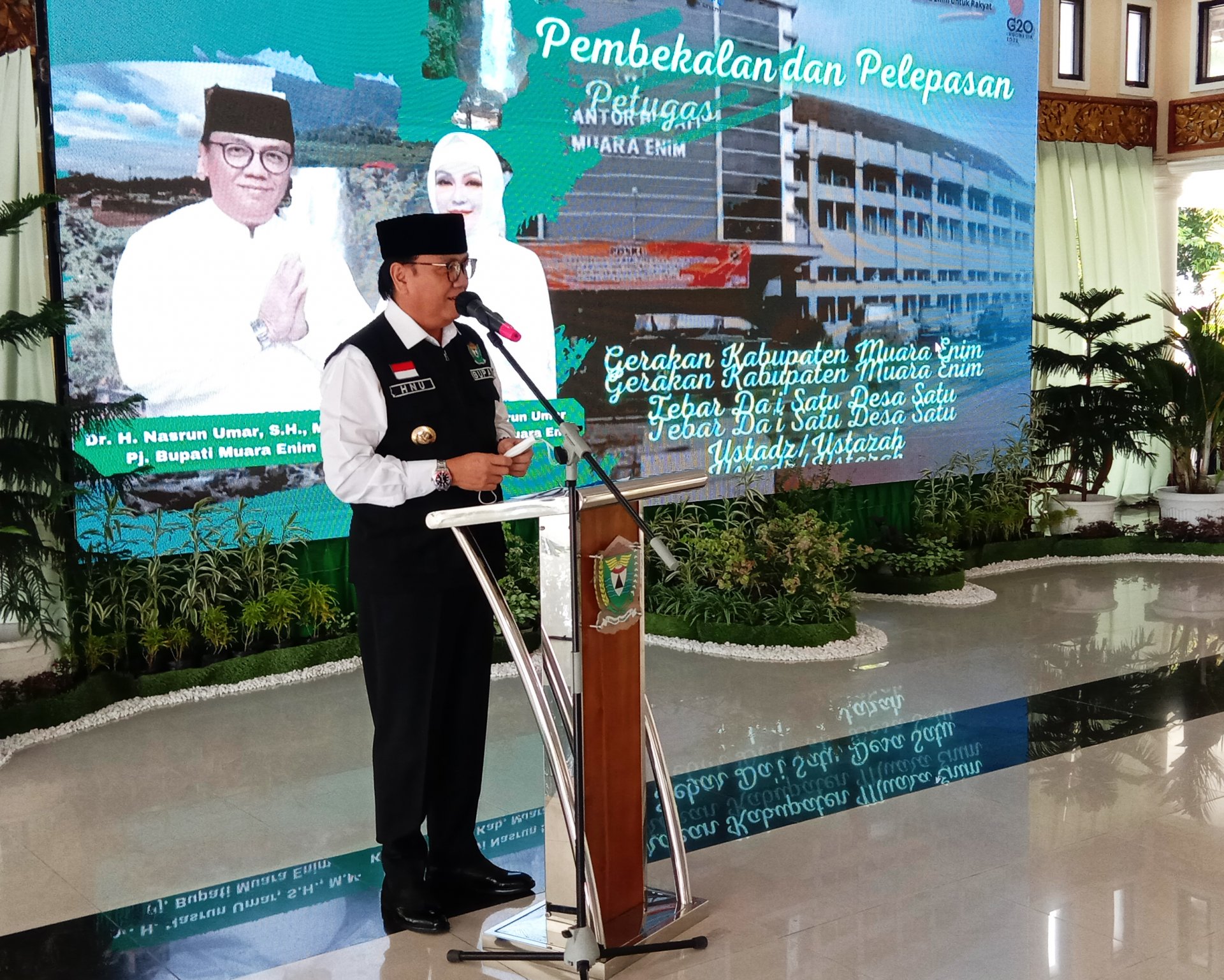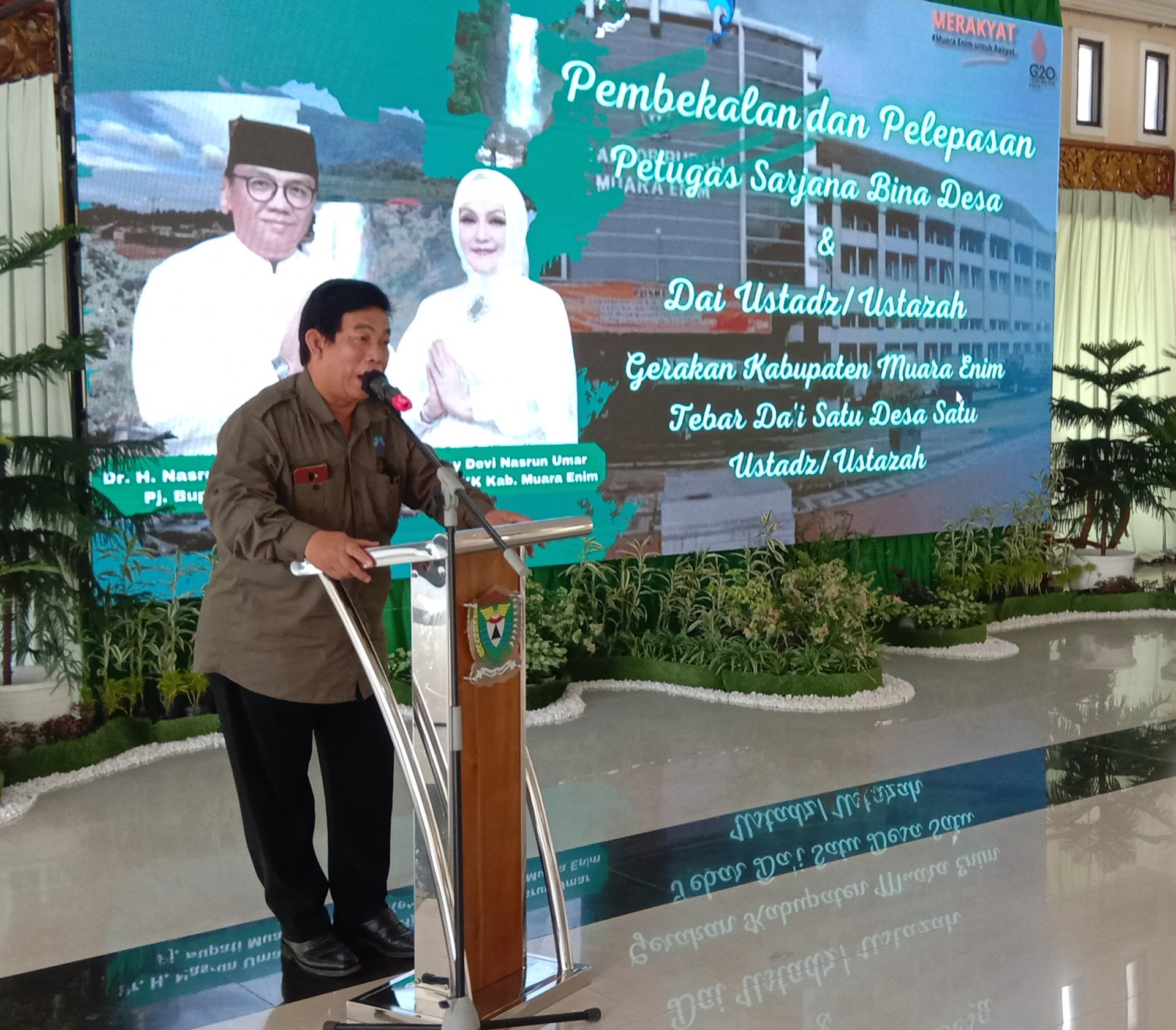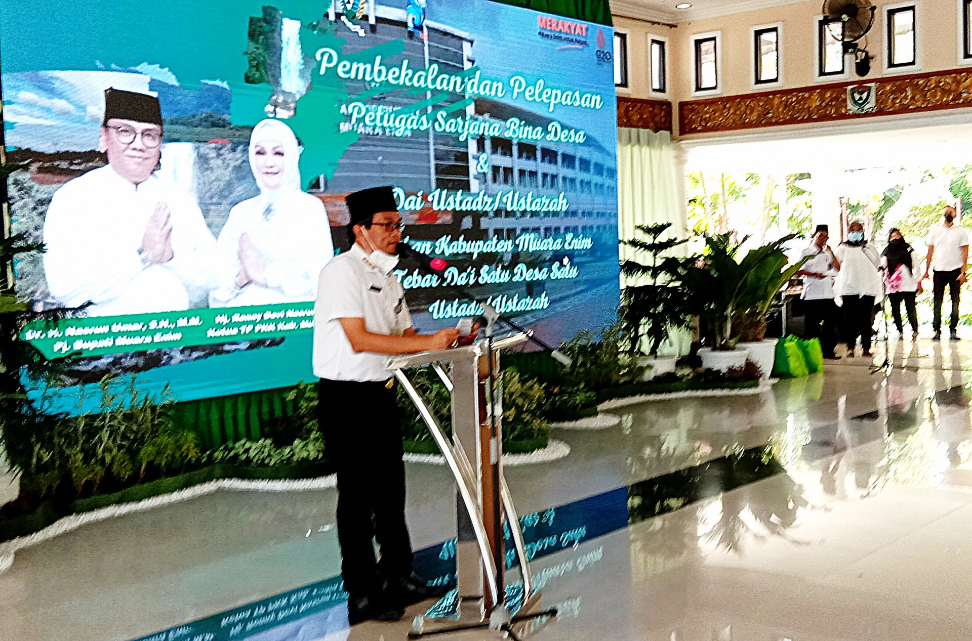 “Besar harapan saya, keberadaan para da’i ustadz ustadzah maupun para petugas sarjana bina desa yang nantinya bertugas selama 12 bulan di 22 kecamatan ini dapat benar-benar menjadi penyejuk yang memancarkan cahaya Islam bagi Kab. Muara Enim serta menyebarkan nilai-nilai persatuan umat yang nantinya atas izin Allah S.W.T. dari Kabupaten ini akan banyak muncul generasi handal yang menjadi pemimpin umat, rahmatan lil ‘allamin. Aamiin Ya Rabalalamin,” ucap Pj Bupati.