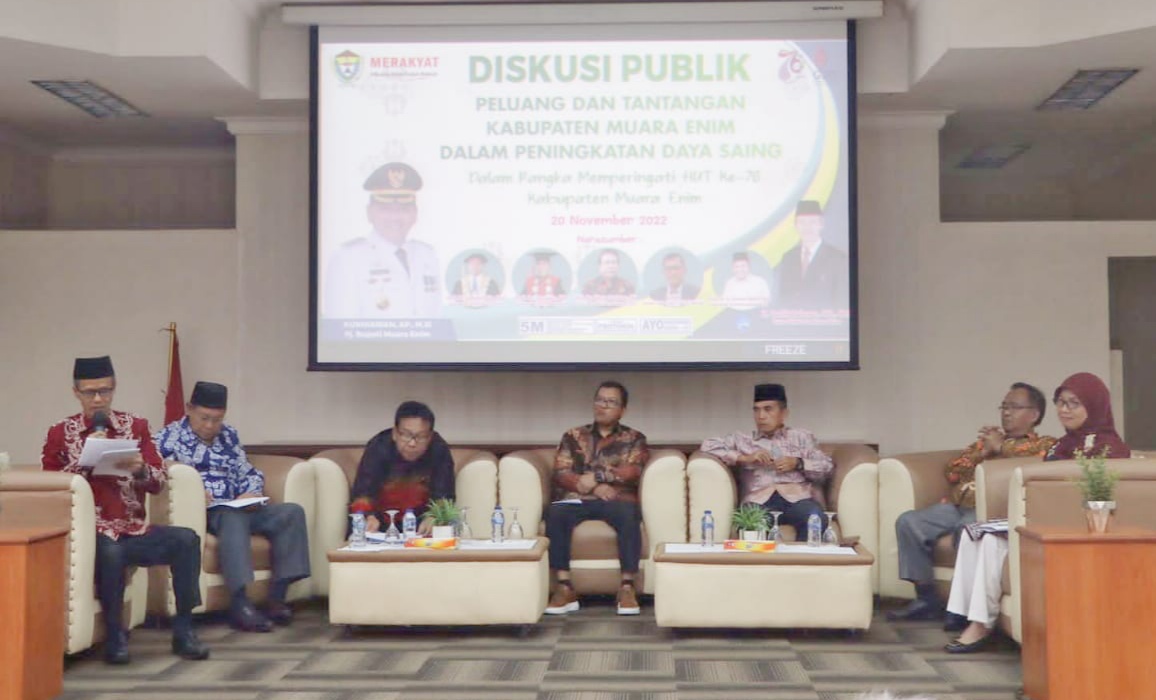 Kegiatan yang dihadiri Tokoh sekaligus Akademisi yakni Prof. Dr. H. Idzam Fautanu, M.A., Prof. Dr. Ir. H. Syamsul Bahri, M.S., Prof. Dr. Izomiddin, M.A., Prof. Dr. Ir. H. Amin Rejo, M.Si., di Ruang Rapat Pangripta Nusantara, Kantor Bappeda Muara Enim. Dalam diskusi yang mengangkat tema Peluang dan Tantangan Kabupaten Muara Enim Dalam Peningkatan Daya Saing itu dihadiri pula sejumlah tokoh masyarakat.