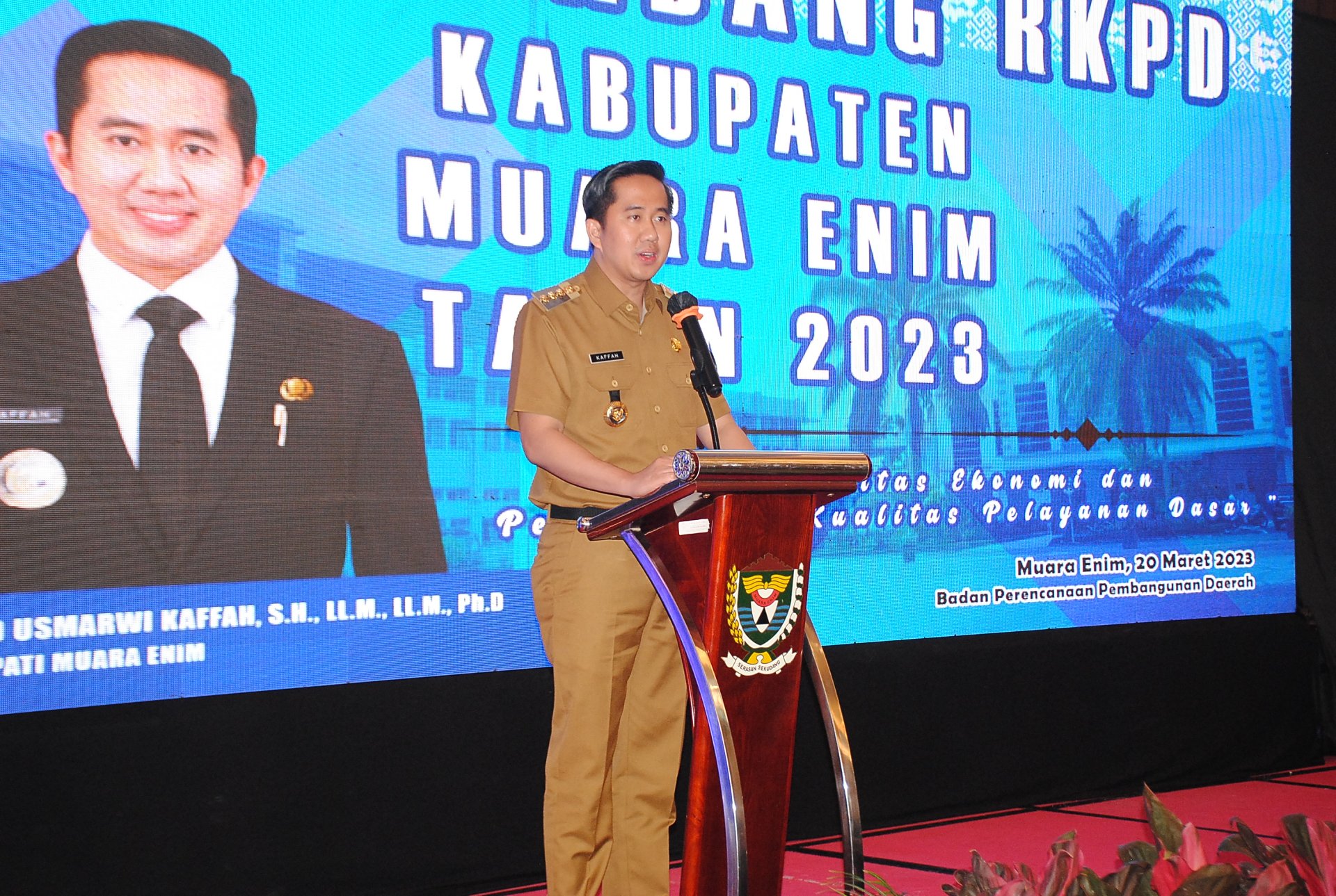 Plt. Bupati Muara Enim Usmarwi Kaffah, S.H., LL.M., LL.M., Ph.D., pada sambutannya menyampaikan bahwa Musrembang adalah tahapan sistematis oleh karena itu musrembang ini merupakan wadah kita untuk menyatukan semangat hati dan pikiran kita dalam konteks menetapkan prioritas pembangunan kita mengukur kinerja melihat indikator sampai dengan menargetkan apa-apa yang menjadi target capaian kita di tahun depan musrenbang ini merupakan penyelenggaraan implementasi dari amanat undang-undang nomor 25 tahun 2004 tentang sistem perencanaan nasional dan juga Permendagri nomor 86 tahun 2017 tentang evaluasi dan pengendalian tentang RPJMD dan RKPD.