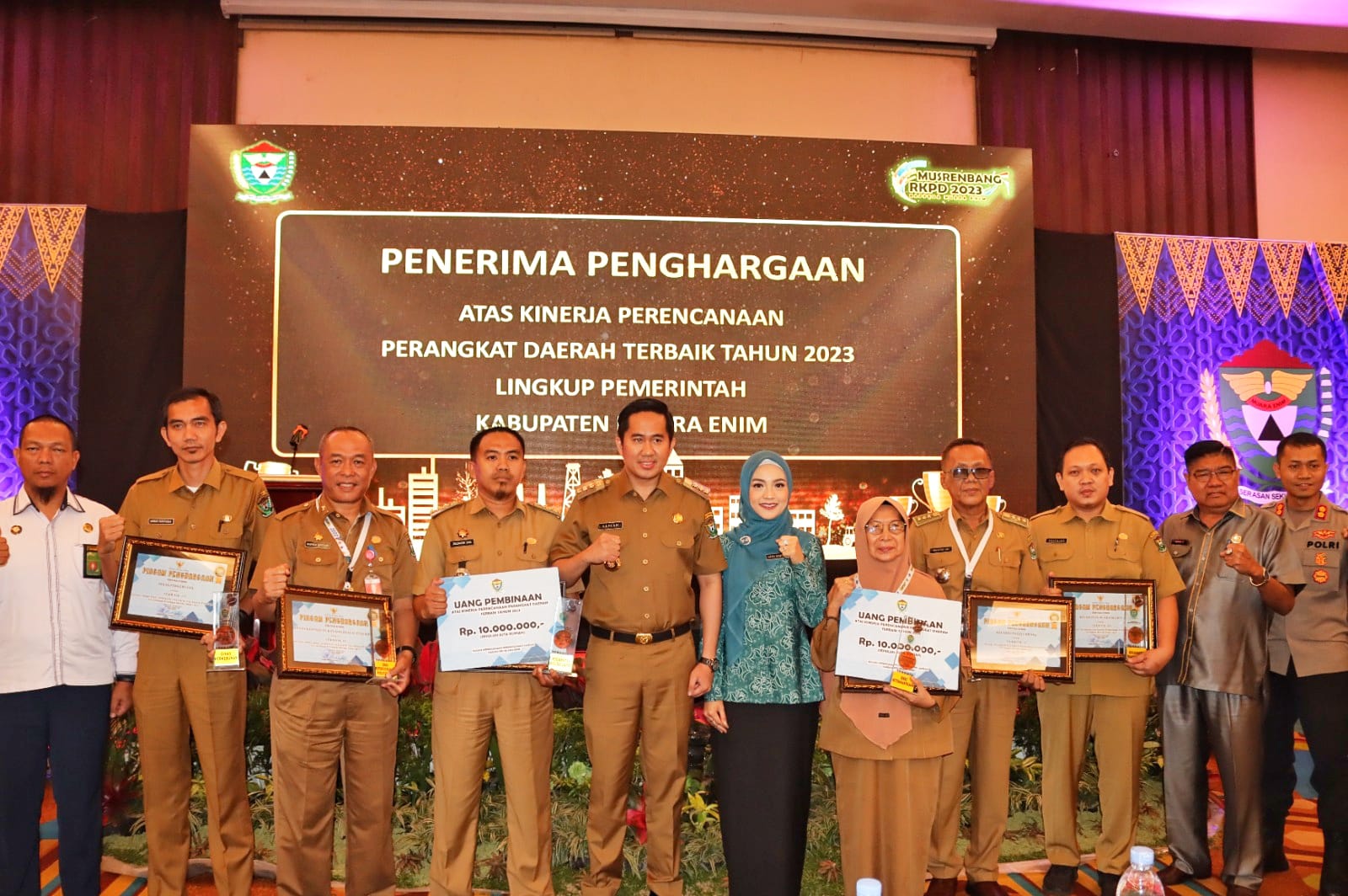 Pada kesempatan itu diberikan penghargaan kepada Organisasi Perangkat Daerah (OPD) atas kinerja perencanaan perangkat daerah terbaik tahun 2023 lingkup Kabupaten Muara Enim kategori Kelengkapan dokumen dan pengendalian sesuai dengan peraturan perundangan kepatuhan penyelesaian dan penyampaian dokumen pengendalian sesuai dengan waktu yang butuhkan serta keselarasan antara dokumen dengan perencanaan konsultasi dan pengendalian partisipasi dalam setiap Pembangunan yakni terbaik I Dinas Ketenagakerjaan; terbaik II Dinas Kependudukan & Pencatatan Sipil, terbaik III Dinas Perkebunan. Sementara Untuk kategori kecamatan, peringkat I Kecamatan Belida Darat, peringkat II Kecamatan Gelumbang; dan peringkat III Kecamatan Muara Belida.